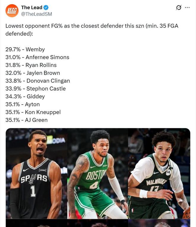 值得關注的是,文班亞馬還有2項數據高居聯盟第1。第1、文班亞馬場均送出4.8次封蓋,排名聯盟第1。第2、美媒The Lead列出了一項防守數據統計,本賽季在防守對位時讓對手投籃命中率最低的球員(至少防守35次出手)排行,其中文班亞馬(29.7%)排在第一。